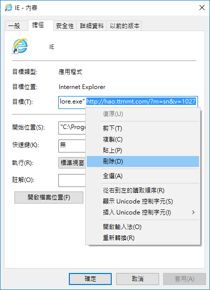 10 在桌面找瀏覽器(IE/Chrome/Firefox)捷徑按右鍵->內容,在目標欄位後面的http://hao.ttmmt.com......網址刪除。